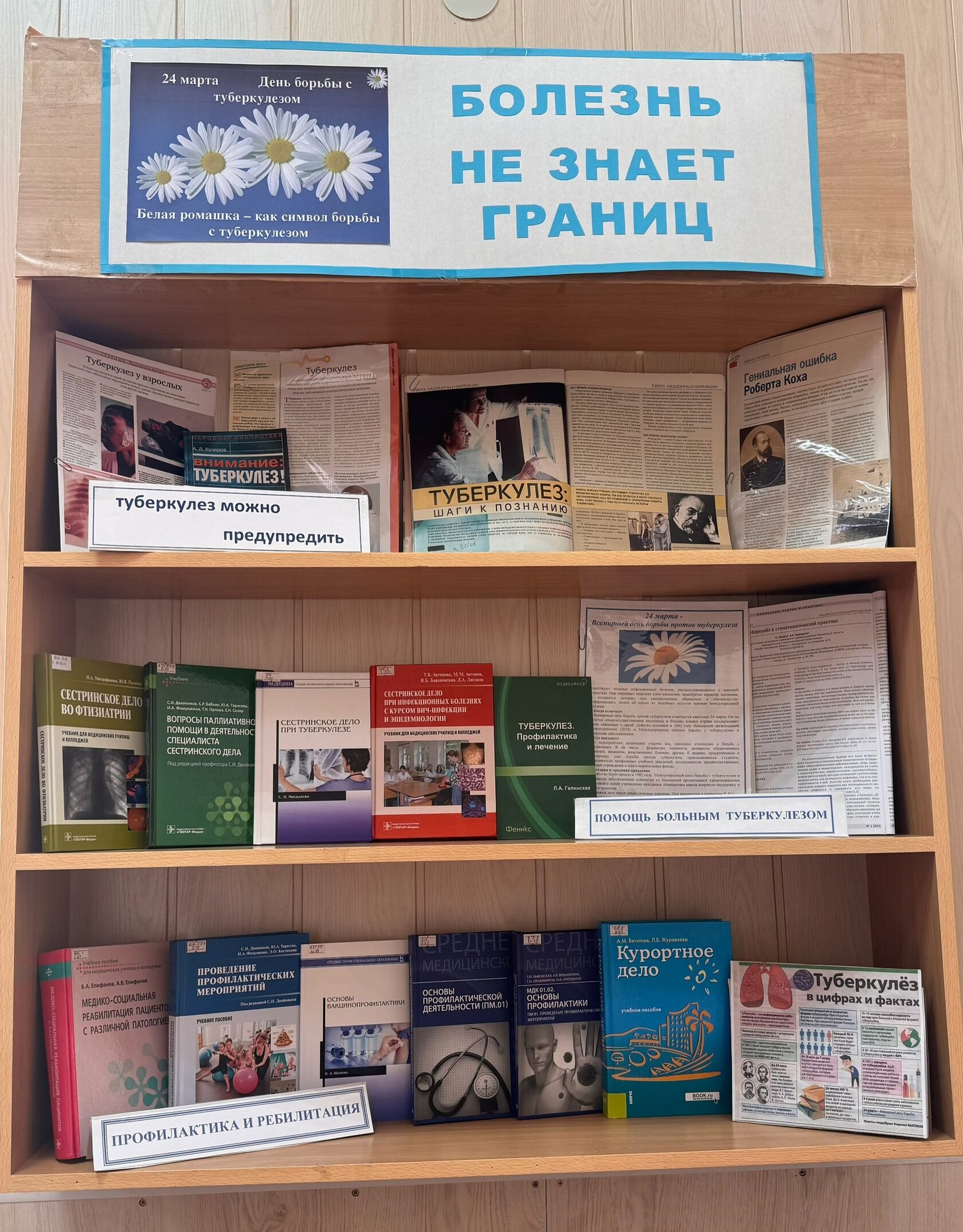 24 марта Всемирный день борьбы с туберкулезом. В читальном зале колледжа оформлена выставка «Болезнь не знает границ». Выставка призвана привлечь внимание к проблеме туберкулеза, повысить осведомленность читателей о профилактике, диагностики и лечении этого заболевания, о возможных источниках заражения; главными условиями распространения болезни являются вредные привычки (курение, алкоголь, наркомания)